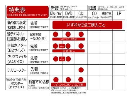 『中島みゆきコンサート「歌会 VOL.1」』Blu-ray/DVD、CDの中からBlu-ray/DVDいずれか1点と『中島みゆきコンサート「歌会 VOL.1」-LIVE SELECTION-』CDの2点を同時購入で告知ポスターを先着でプレゼント。
